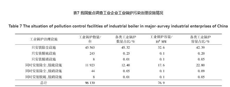 對工業鍋爐的除塵、脫硫和脫硝3種廢氣治理設施進行了統計。工業鍋爐中,只安裝除塵設施的有43 563臺,占調查總數的45.3%,即超過一半以上的工業鍋爐無任何除塵設施,產生的煙粉塵直排;只安裝脫硫設施的有243臺,同時安裝除塵、脫硫設施的有11 923臺,說明絕大多數工業鍋爐未安裝專門的脫硫設施,僅安裝了有脫硫效果的除塵脫硫一體化裝置;安裝脫硝設施的可以忽略不計。詳見表7。